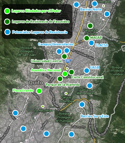 Para contrarrestar esta forma de ejercer el poder, consideramos que se pueden combinar estrategias que utilicen como espacios de la esperanza aquellos lugares como los barrios de Quito o el interior de las universidades, con una estrategia que trate de tomar los espacios del poder de forma imaginativa y pacífica, que consiga romper con el miedo y el disciplinamiento del espacio que está pretendiendo el Estado para desmovilizar el descontento generado por la decisión de continuar explotando el petróleo de la amazonía ecuatoriana.