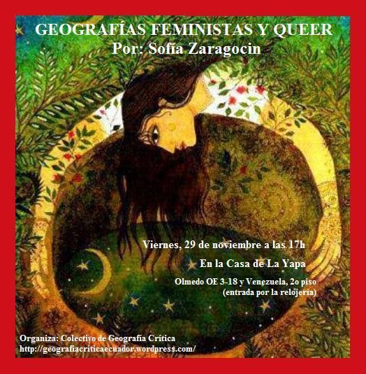 El próximo viernes 29 de noviembre, desde el colectivo organizamos una charla sobre Geografías Feministas y Queer a cargo de Sofía Zaragocin en la Casa de La Yapa, en el centro histórico de Quito (Olmedo y Venezuela).