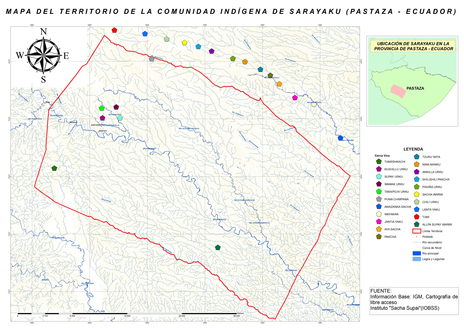 El mapa que se presenta a continuación es la delimitación del territorio de la comunidad Sarayaku y la ubicación de las especies forestales para las cercas vivas del mismo. Este mapa es parte del plan para el Buen Vivir o Kawsak Sacha que se ha creado como uno de los resultados de la organización comunitaria para la defensa del territorio.