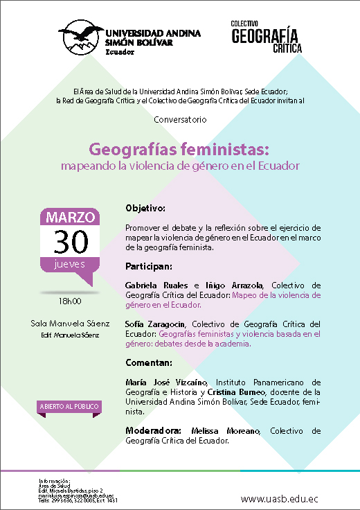 Más información: http://www.uasb.edu.ec/web/guest/contenido?conversatorio-geografias-feministas-mapeando-la-violencia-de-genero-en-el-ecuador-