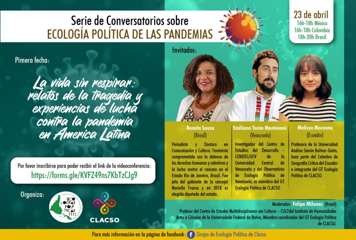 Melissa Moreano, del Colectivo de Geografía Crítica, participará en el conversatorio “La vida sin respirar: relatos de la tragedia y experiencias de lucha contra la pandemia en América Latina” este jueves 23 de abril a las 16h00 (hora México/Colombia/Ecuador, 18h00 hora Brasil). El conversatorio es parte de la Serie de Conversatorios sobre Ecología Política de las Pandemias organizado por el Grupo de Trabajo de Ecología Política de CLACSO.
