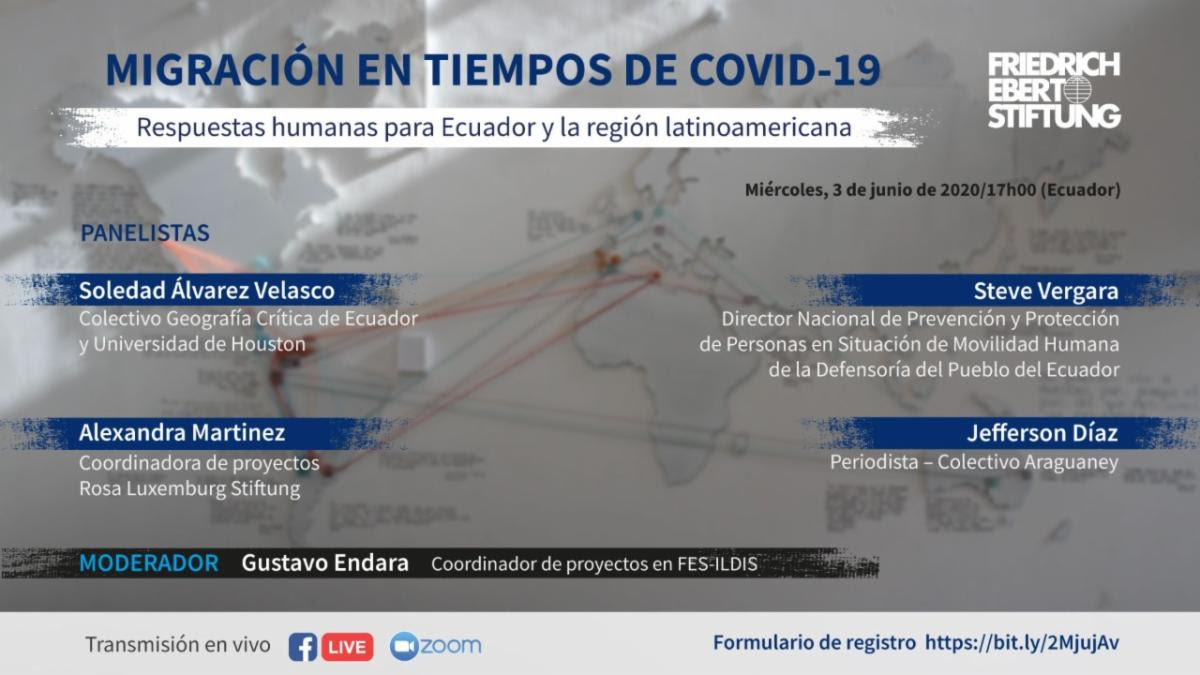 El 3 de junio a las 17h el FES-ILDIS organiza el conversatorio “Migración en tiempos de COVID-19: Respuestas humanas para Ecuador y la región latinoamericana” en el que participará Soledad Álvared, del Colectivo y la Universidad de Houston, junto a Alexandra Martínez de la Fundación Rosa Luxemburgo, Steve Vergara de la Defensoría del Pueblo, y Jefferson Díaz del Colectivo Araguaney, moderado por Gustavo Endara de FES-ILDIS. En el siguiente link se encentra el formulario de registro: