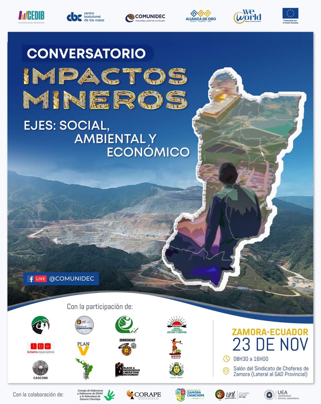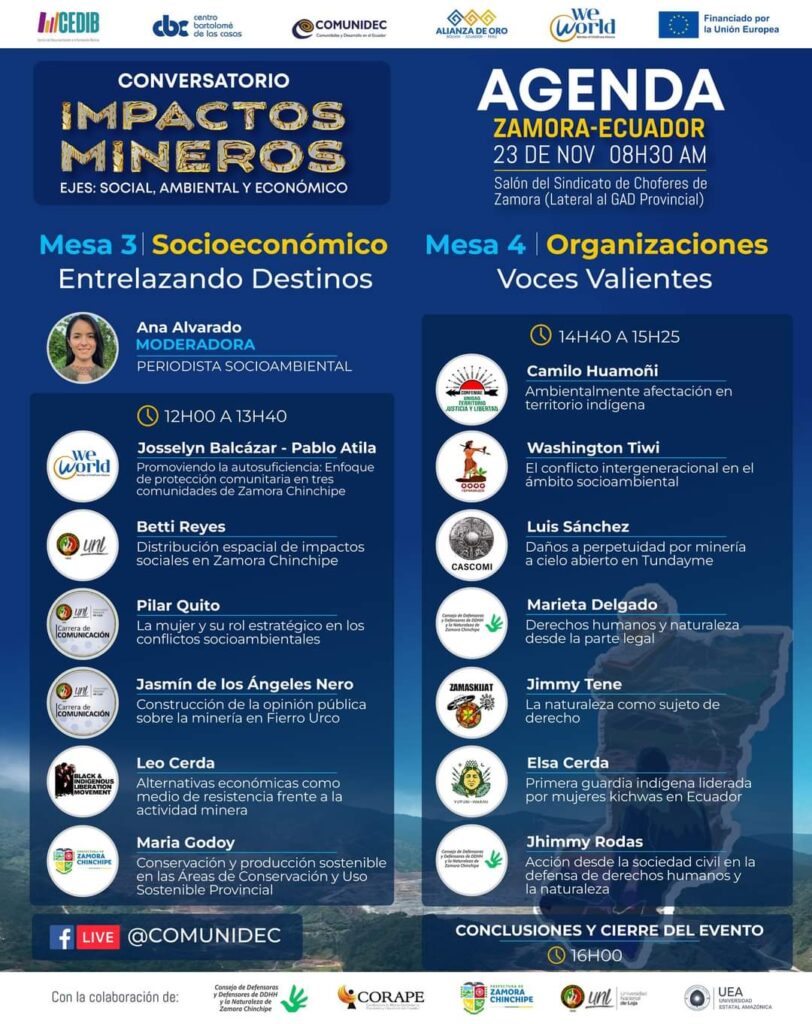El evento se realizará en la ciudad de Zamora, el día 23 de noviembre del 2023, en el salón del Sindicato de Choferes de Zamora (Junto al GAD Provincial de Zamora Chinchipe) y será visible en línea en el Facebook de COMUNIDEC, quienes son organizadores del evento junto a CONSEJO DE DEFENSORAS Y DEFENSORES DE LOS DERECHOS HUMANOS Y DE LA NATURALEZA DE ZAMORA CHINCHIPE, CORAPE Coordinadora de Medios Comunitarios, Populares y Educativos del Ecuador , Universidad Nacional de Loja y la Universidad Estatal Amazónica.